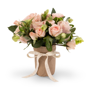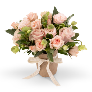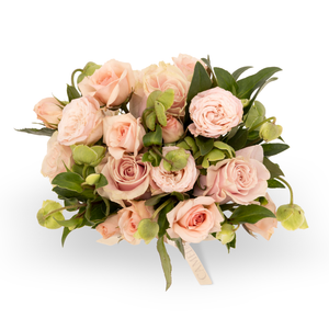 A serene and sophisticatedfloral arrangement designed to offer a moment of peace and beauty. Filled with lush garden roses and delicate helleborus, this bouquet is a calming escape.